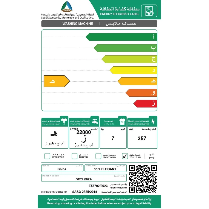 - الاستهلاك السنوي للطاقة : 257 كيلو وات / الساعة
