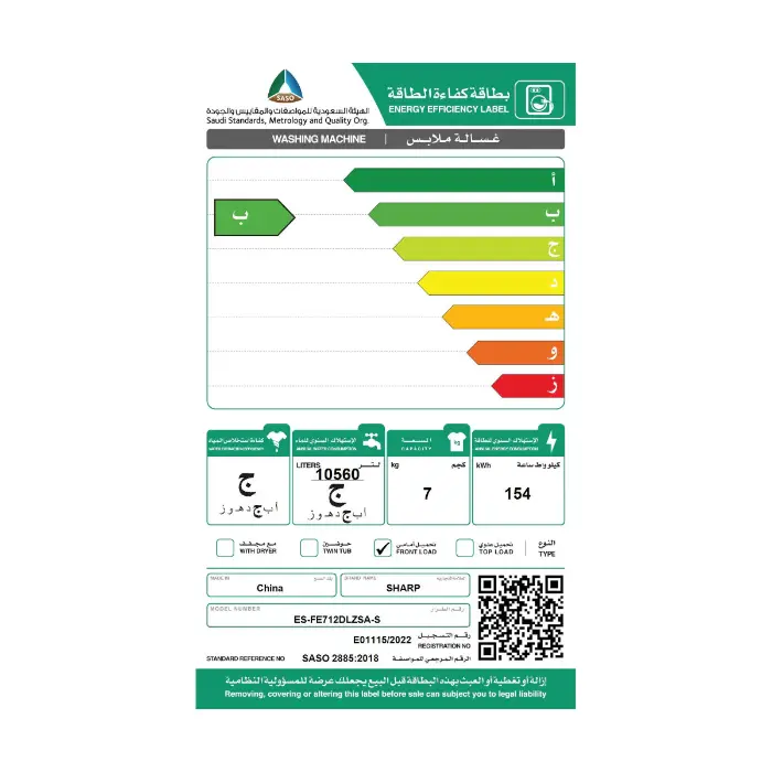 غسالة ملابس شارب 7 كيلو أمامية – 16 برنامج – فضي ES-FE712DLZSA-S