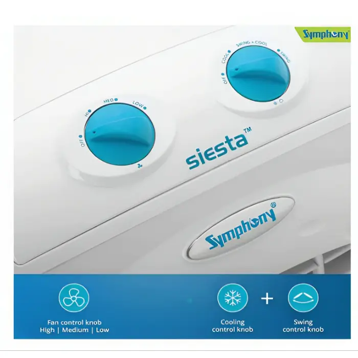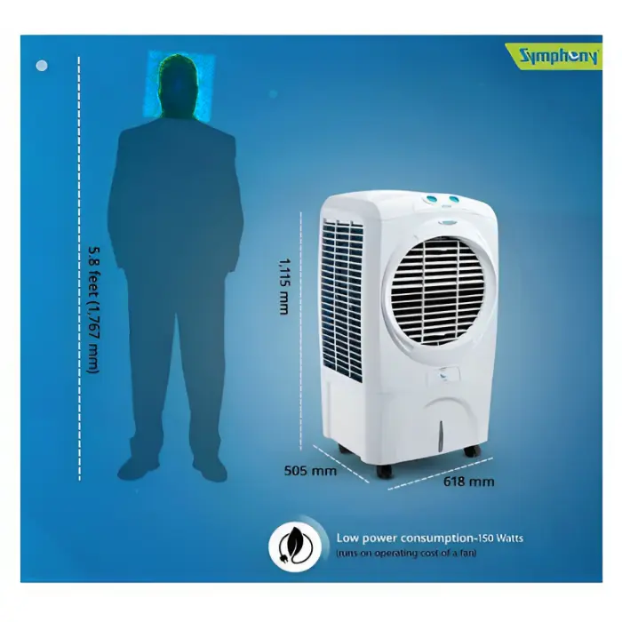 يعد مكيف الهواء سيمفوني من المكيفات المثالية لخفض درجات الحرارة في غرف النوم الصغيرة والمكاتب والمساحات الشخصية حيث عمل علي تبريد الغرفة في أقل وقت ممكن بالإضافة الي توزيع الهواء المثالي داخل المساحة المكيفة