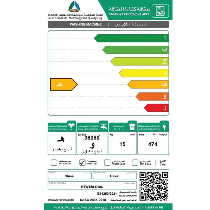 غسالة هاير حوضين – 15 كيلو – أبيض HTW150-S186