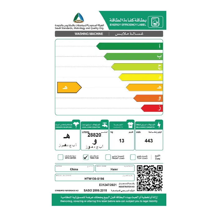 غسالة حوضين هاير – 13 كيلو – أبيض HTW130-S186