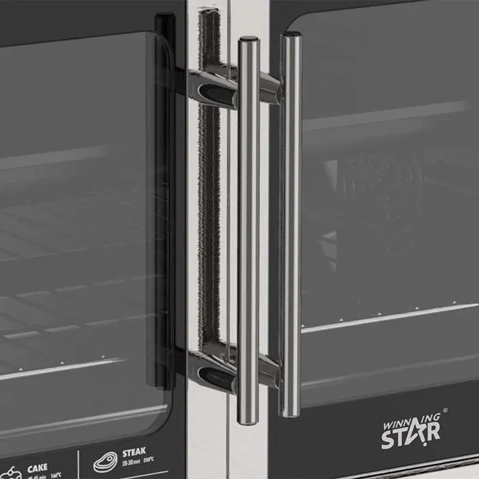 يتميز فرن كهرباء ويننج ستار بباب زجاجي مزدوج من النوع الفرنسي يجمع بين الأناقة والوظيفية. هذا الباب يسمح لك بمراقبة الطعام أثناء الطهي دون الحاجة لفتحه، ما يحافظ على الحرارة داخل الفرن ويضمن نتائج متساوية. التصميم الزجاجي يضفي لمسة جمالية على المطبخ ويجعل استخدام الجهاز أكثر راحة وسهولة في كل مرة.