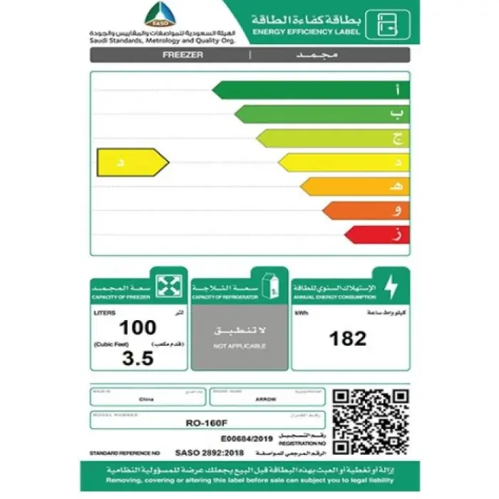 - معدل الاستهلاك السنوي للطاقة : 182 كيلو وات/ساعة