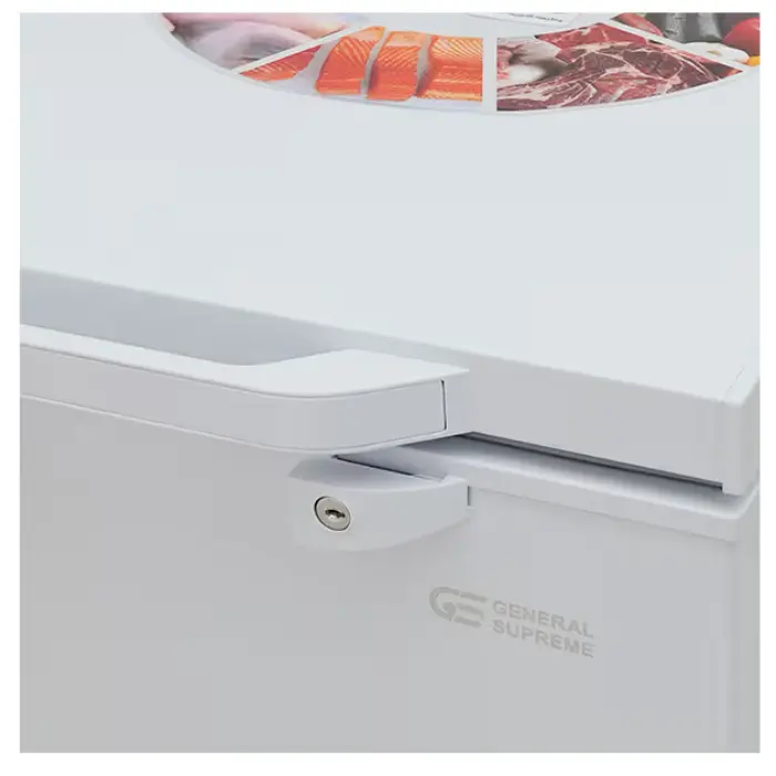 لضمان سلامة المحتويات، يحتوي فريزر أرضى جنرال سوبريم على قفل أمان أمامي يمنع فتح الغطاء بشكل غير مرغوب فيه، مما يجعله أكثر أمانًا في المنازل التي تحتوي على أطفال أو في الاستخدام التجاري.