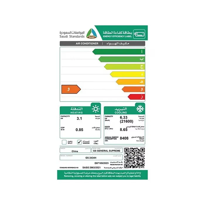 مكيف شباك جنرال سوبريم 21600 وحدة – حار و بارد GS2434H