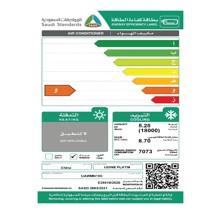 مكيف يوجين شباك بلاتين 18000 وحدة – بارد UAWMN18C