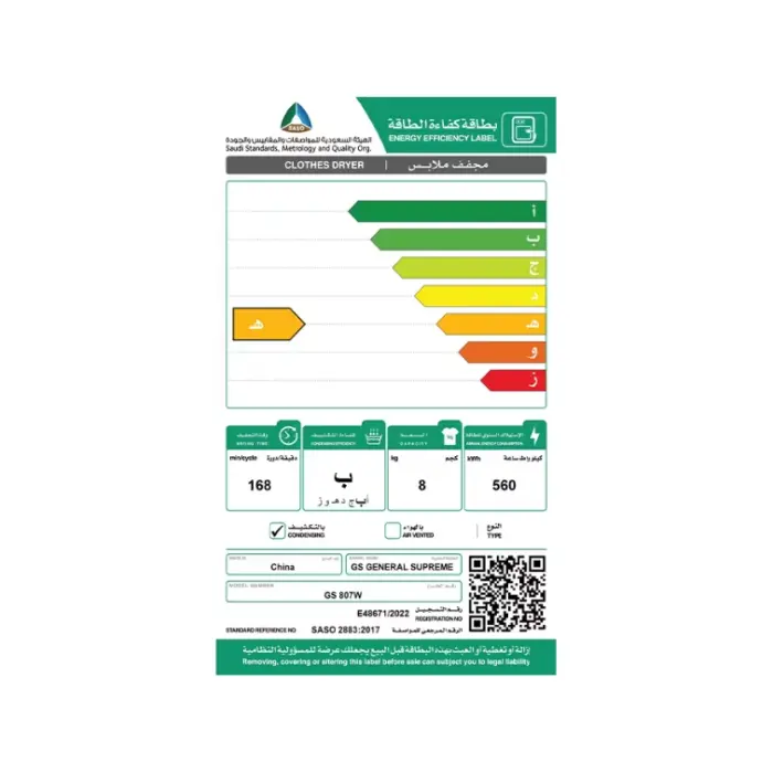 مجفف جنرال سوبريم 8 كيلو مع مكثف – 16 برنامج – أبيض GS807W